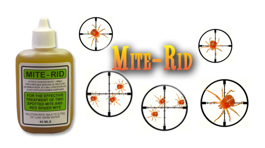 Mite-Rid is a fully bio-degradable miticide, is not toxic to animals, and under normal use will not affect the plant's metabolism. Highly effective against two-spotted and red mites, Mite-Rid is also reporting success with Eriophyid mites such as the "Fuschia Gall Mite" which is endemic to parts of California and also known as the "Mendo" or "Mendocino mini", (see the testimonial).